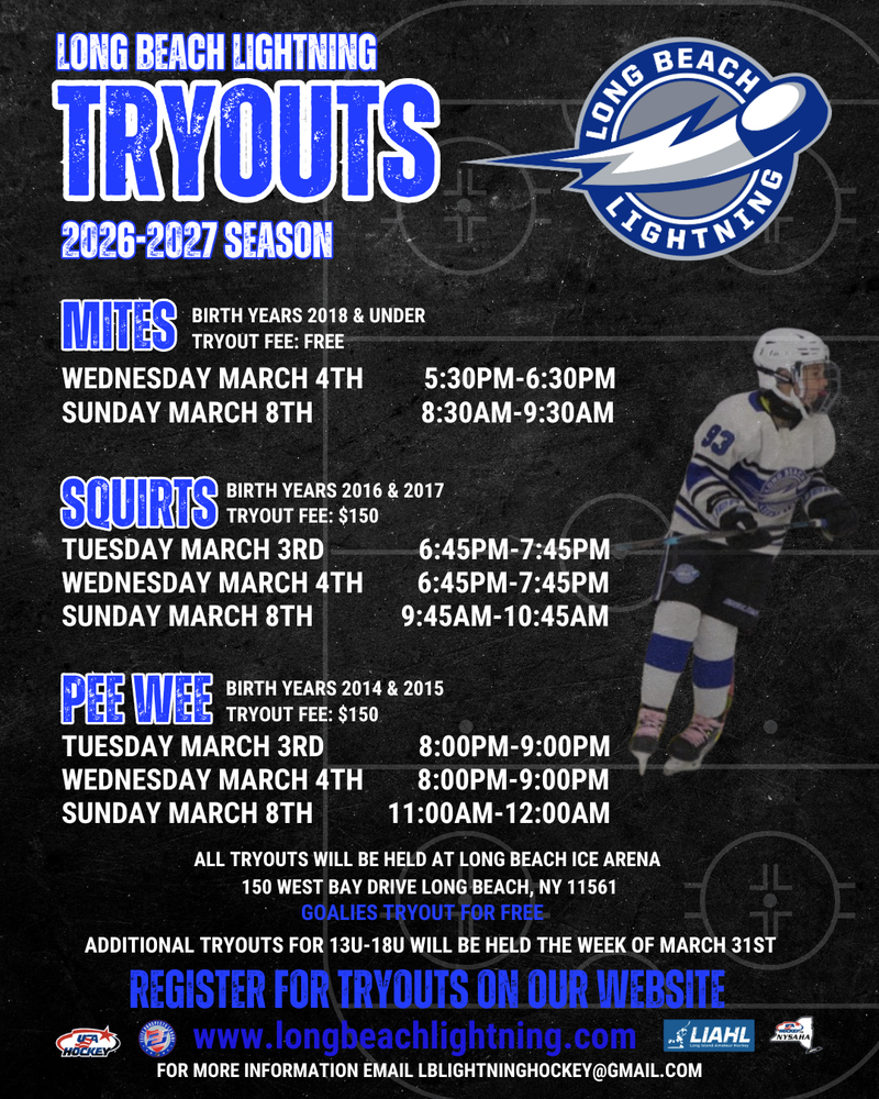 Players are expected to attend all tryout dates. Any player coming from another LIAHL organization must have an original NYSAHA player-released form with a raised seal to tryout. We expect to have 3 teams at the Mite level and 2 teams at both the Squirt & Pee Wee level. All players will be expected to sign the NYS Player Commitment form before the final tryout.