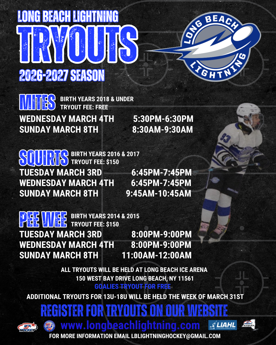 Players are expected to attend all tryout dates. Any player coming from another LIAHL organization must have an original NYSAHA player release form with a raised seal in order to tryout. All players will be expected to sign the NYS Player Commitment form before the final tryout.